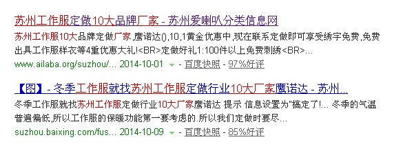 很多工作服厂家都会选择“苏州工作服”这样的词来做竞价,那么很多搜索结果中,这些厂家是否是苏州的呢?答案是不肯定的,因为很多外地商家一般采用很高的价格来竞争这几个词的,所以结果并不是苏州的工作服厂家,可以尝试通过描述来判断,一般作为苏州地区的工作服厂家,都会采用写上苏州这个词,可以通过判断描述中苏州这个词是否单独飘红,单独呈现红色的,就一定是苏州工作服的厂家。