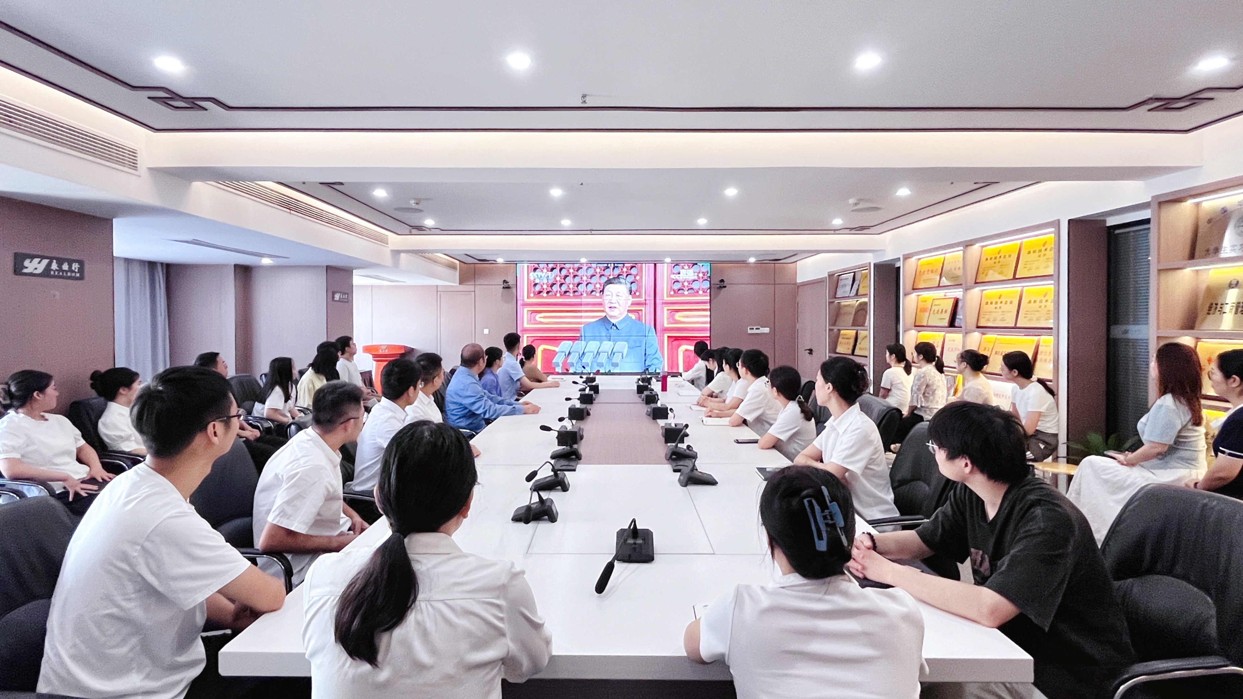 为铭记历史、缅怀先烈、弘扬伟大的抗战精神,增强全体员工的爱国情怀,2025年9月3日,永业行组织总分部全体党员、员工齐聚会议室,集中观看纪念中国人民抗日战争暨世界反法西斯战争胜利80周年阅兵式。 上午9时,直播正式开始。当雄壮的国歌响彻天安门广场,会议室内的全体人员肃然起立,齐唱国歌,歌声激荡着每个人的爱国之心。随后,中共中央总书记、国家主席、中央军委主席习近平发表重要讲话,深刻回顾了中国人民抗日战争和世界反法西斯战争的伟大历程,强调“铭记历史、缅怀先烈、珍爱和平、开创未来”的时代使命。习近平总书记的话语字字千钧,引发在场员工的强烈共鸣,大家深刻感