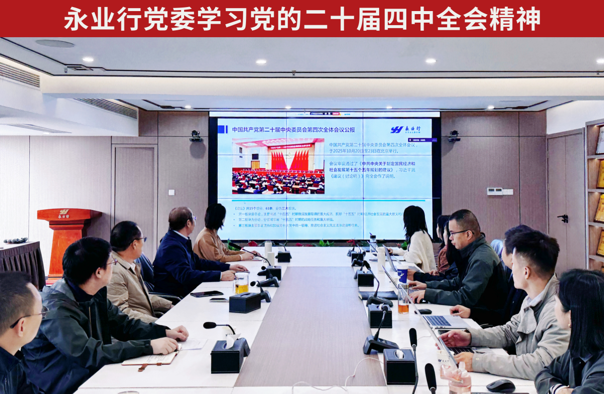2025年10月26日,永业行召开党委(扩大)会议,组织专题学习党的二十届四中全会精神,强化党建引领,推动企业高质量发展。永业行党委书记、董事长潘世炳及全体高管、各民主党派永业行支部委员、各部门负责人、业务骨干参加学习会议。 会上,研究院(碳中和研究中心)系统介绍了《中国共产党第二十届中央委员会第四次全体会议公报》,重点阐述了“十五五”时期经济社会发展的主要目标,深入剖析“六个坚持”重要原则,并立足永业行发展实际,结合全会提出的12项战略任务,围绕构建现代化产业体系、深化市场经济改革、推进绿色低碳发展等方面,进行具体解析并提出将
