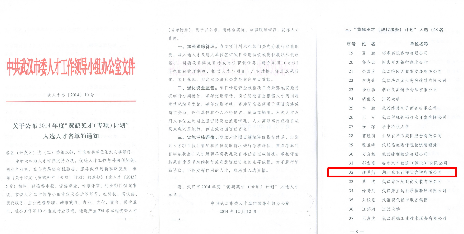近日,中共武汉市委人才工作领导小组办公室公布了2014年度黄鹤英才(专项)计划入选人才“名单,永业行总裁潘世炳入选黄鹤英才(现代服务)计划人选。