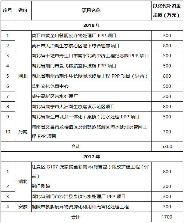 近日,中央财政下达2018年普惠金融发展专项资金120亿元,其中PPP项目以奖代补资金23亿元,共有383个新建项目以及11个存量项目获得了该项奖补资金。湖北省有41个PPP项目获得共计2.34亿元奖补资金,获奖项目数量和金额均位列全国第一。2017年财政部拨付普惠金融发展专项资金116亿元,其中PPP项目以奖代补资金18亿元(含湖北省12个PPP项目共0.9亿元资金)。