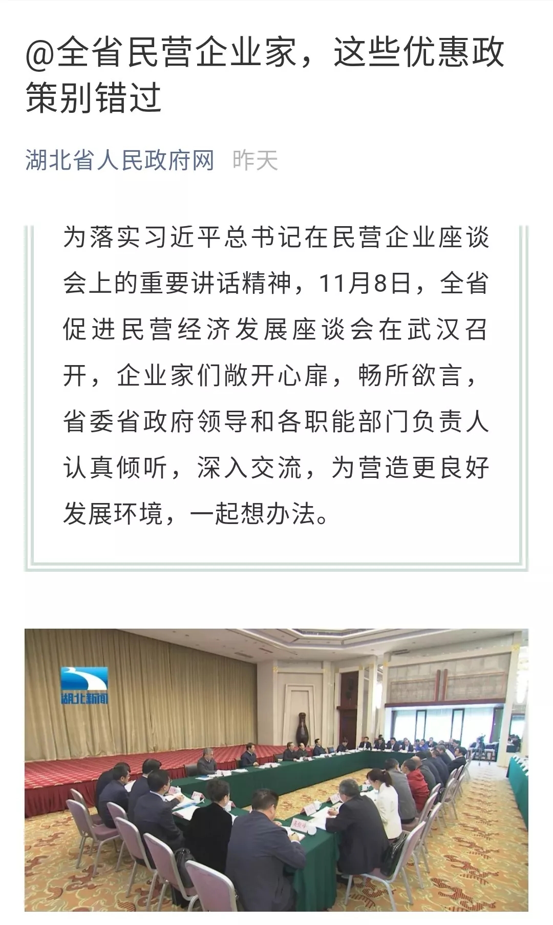 2018年11月10日的湖北卫视湖北新闻和湖北省人民政府网上,发布了题为《@全省民营企业家,这些优惠政策别错过》的新闻稿,介绍了11月1日中央民营企业座谈会和11月8日湖北省促进民营经济发展座谈会后,中央和湖北省支持民营企业发展的优惠政策,以及民营企业家的感受和心声。