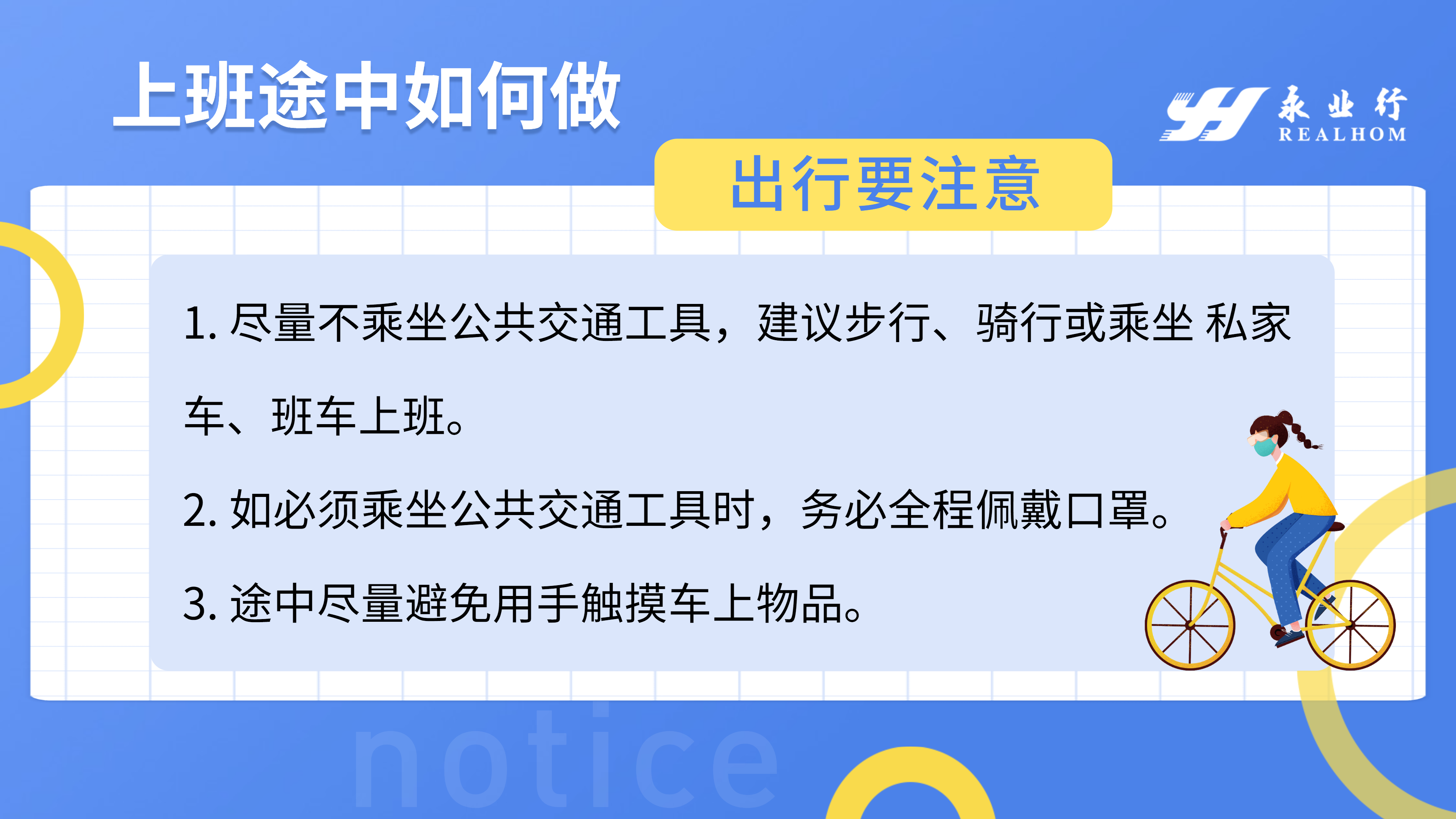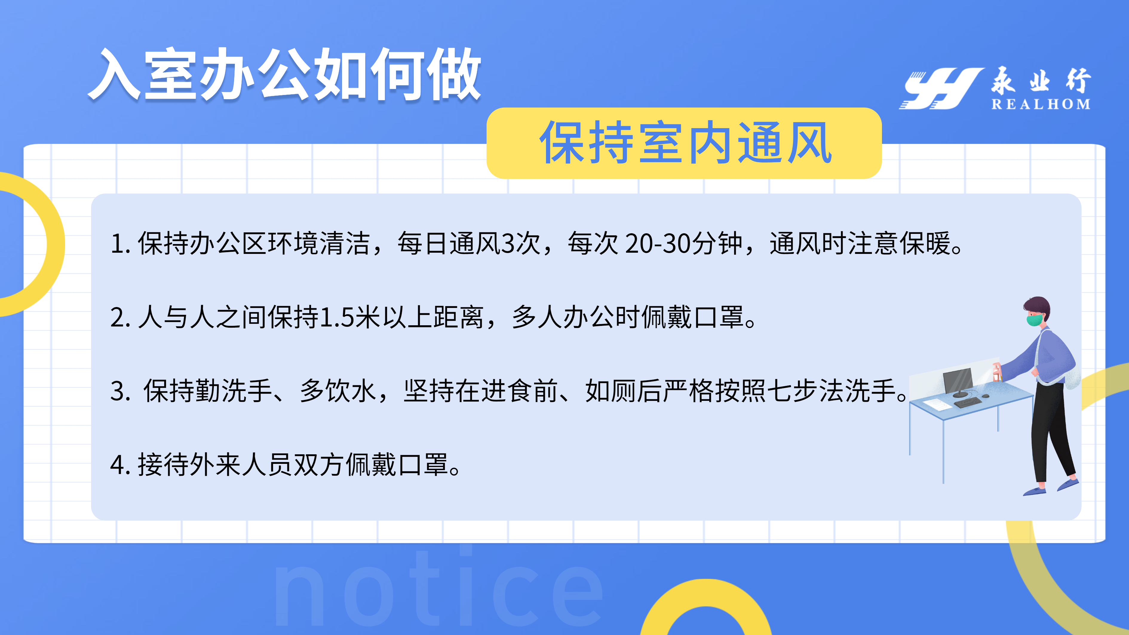 成立疫情防控及复工工作领导小组,制定《永业行新型冠状病毒疫情防控方案》《永业行疫情防控方案实施细则》《永业行复工疫情处置应急预案》,对健康防护、场所消杀、办公制度、会议管理、员工返岗等工作再梳理、再完善、再部署,做到疫情防控有力、返岗复工有序。自1月23日起每日在线摸查员工健康安全情况,通过视频会议系统,在全司范围内开展疫情防控知识培训,并对办公场所、员工宿舍所进行检查、消杀,切实保障员工身体健康和生命安全。