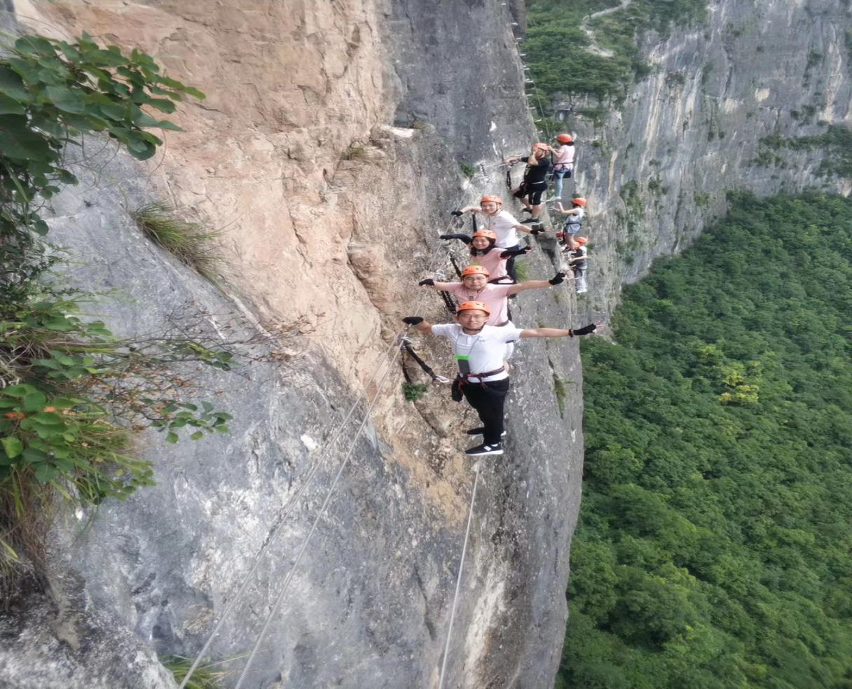 骄阳似火的中午,大家顶着烈日,穿戴好安全设备后,共分两组分别挑战飞拉达800米A线和950米B线。虽然途中有队员因恐高想撤退,但在同组小伙伴的鼓励下,鼓起勇气、毅然前行,最终突破自我极限,完成了挑战。途中不仅领略了攀岩的惊险与刺激,也欣赏了沿途的风景。