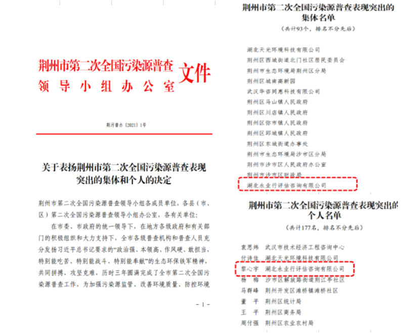 全国第二次污染源普查(以下简称“二污普”)是一项调查重大国情省情的基础工作,是推进生态环境保护的重要举措。自2017年开始,永业行“二污普”永业行承接了湖北省武汉市、荆州市、襄阳市、咸宁市、恩施州等18县(市、区);海南省三亚市、文昌市等6市县区普查工作。其中参与入户7个,参与质量评估17个,合计24个地区。团队历时三年,以专业的技术服务,高质量完成普查工作,为加强污染源监管、改善环境质量、防控环境风险、服务环境与发展综合决策提供了重要依据,获得上级普查机构的认可,受到国家、省市普查办发文表扬,服务的市县更是获得国家和省多项表现突出集体和个人的表扬。