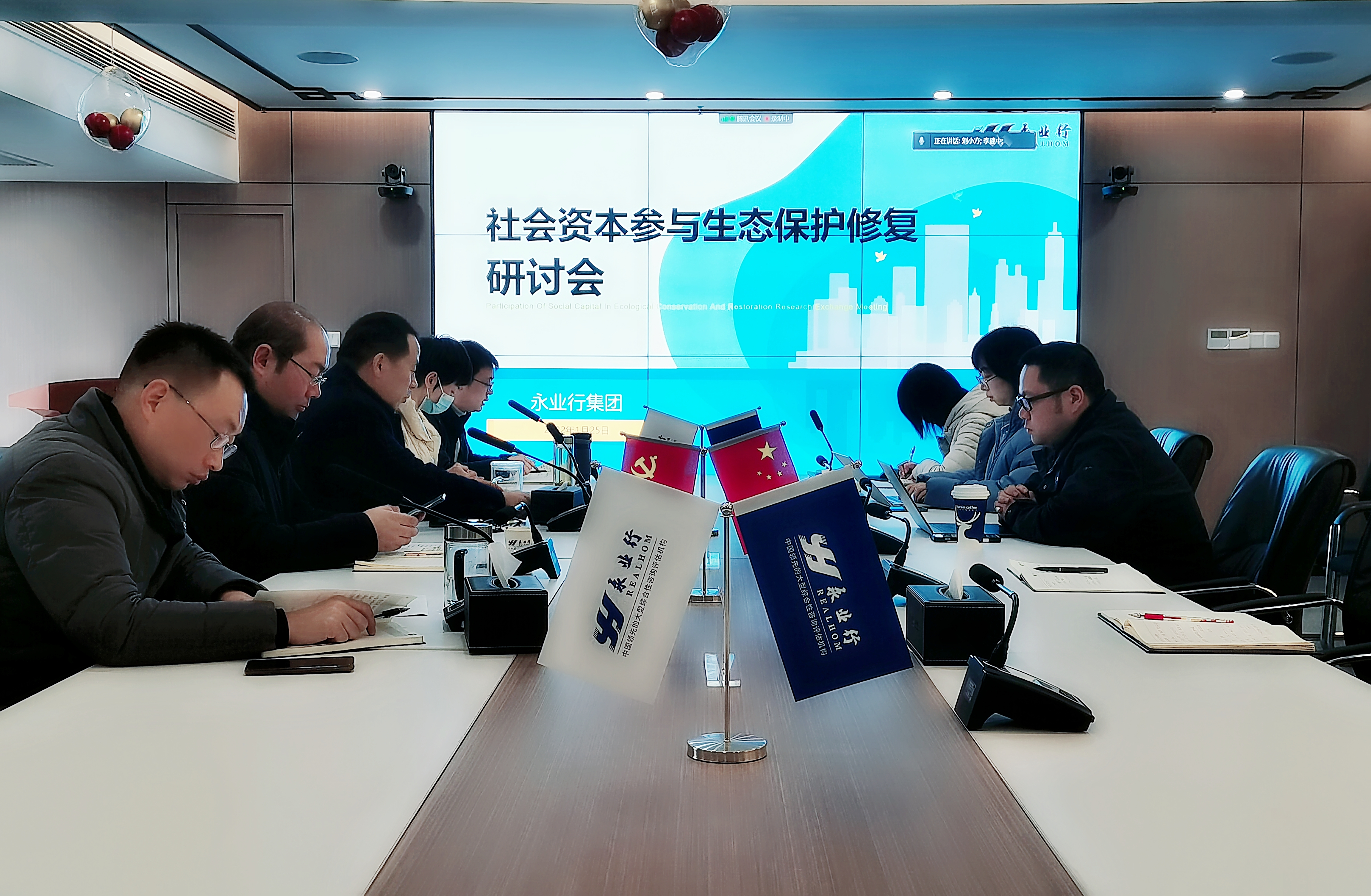2022年1月25日,永业行召开社会资本参与生态保护修复课题研讨会,会议邀请了国家、省主管部门的相关领导及专家进行指导。董事长潘世炳、轮值总裁王琴,副总裁文云波、吴学锋,助理总裁金建华及课题专班成员共计60余人参加会议。