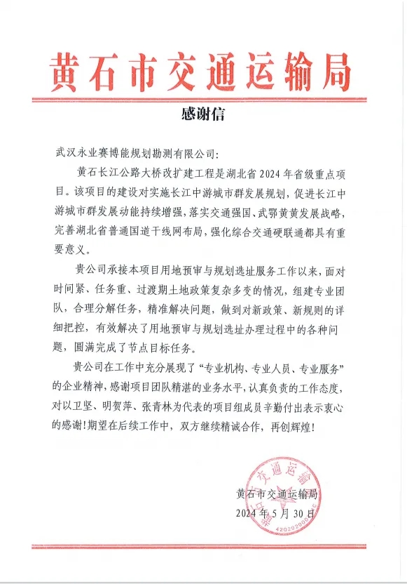 感谢信称,黄石长江公路大桥改扩建工程是湖北省2024年省级重点项目。我公司承接本项目用地预审与规划选址服务工作以来,面对时间紧、任务重、过渡期土地政策复杂多变的情况,项目组成员(卫坚、明贺萍、张青林等)展现了高度的专业精神和职业素养,通过对新政策、新规则的详细把控,合理分解任务,精准解决问题,有效解决了用地预审与规划选址办理过程中的各种问题,顺利促使节点目标圆满完成。