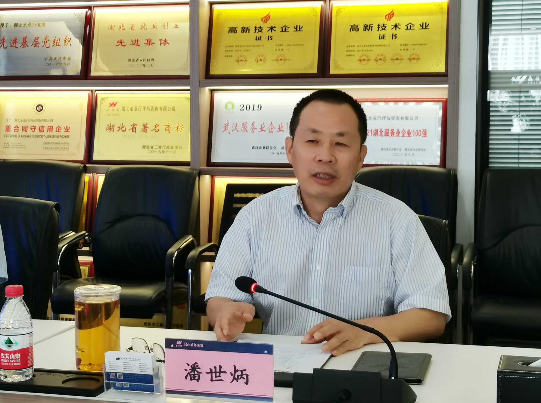 潘世炳对欧阳辉一行莅临永业行表示欢迎,对省政府办公厅及参事馆员联络处多年来对永业行发展的关心与关注表示衷心感谢。从党建引领、创新研发、风险防控、社会责任等方面介绍了永业行经营管理情况和个人履职情况,并就企业、行业发展面临的困难和问题建言献策。